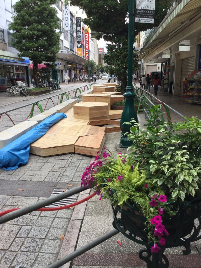 パークレット用ウッドデッキのパーツが搬入され、設置工事が始まりました。