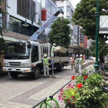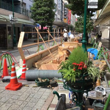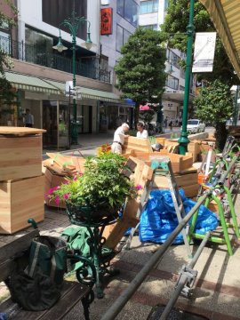 パークレット用ウッドデッキのパーツが搬入され、設置工事が始まりました。